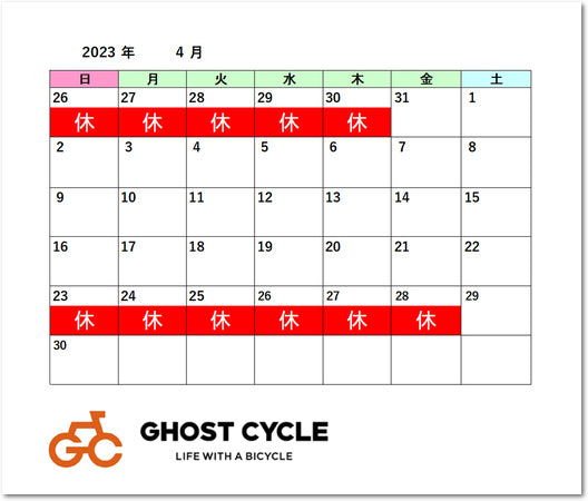 4月の店舗 営業日カレンダー